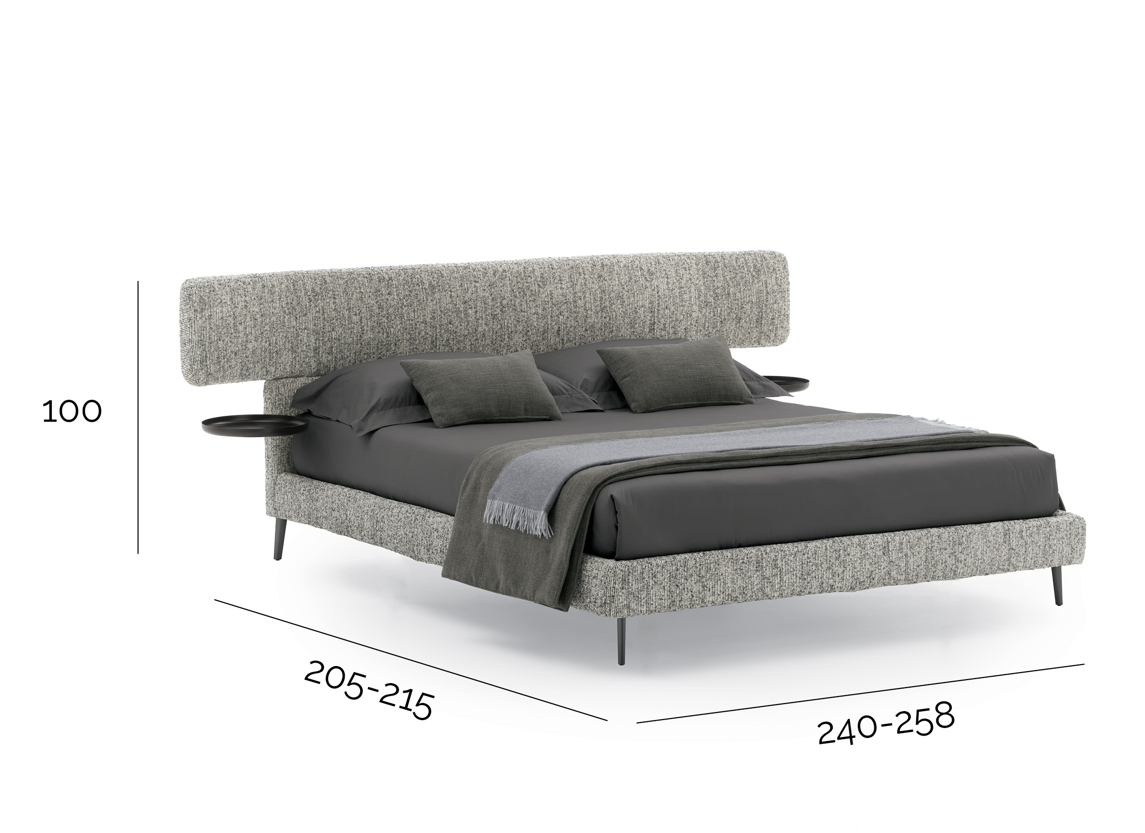 I due tavolini tondi in metallo, integrati nella testata, sono un’alternativa salvaspazio ai comodini tradizionali. Leggeri e discreti, aggiungono personalità senza rinunciare alla praticità.