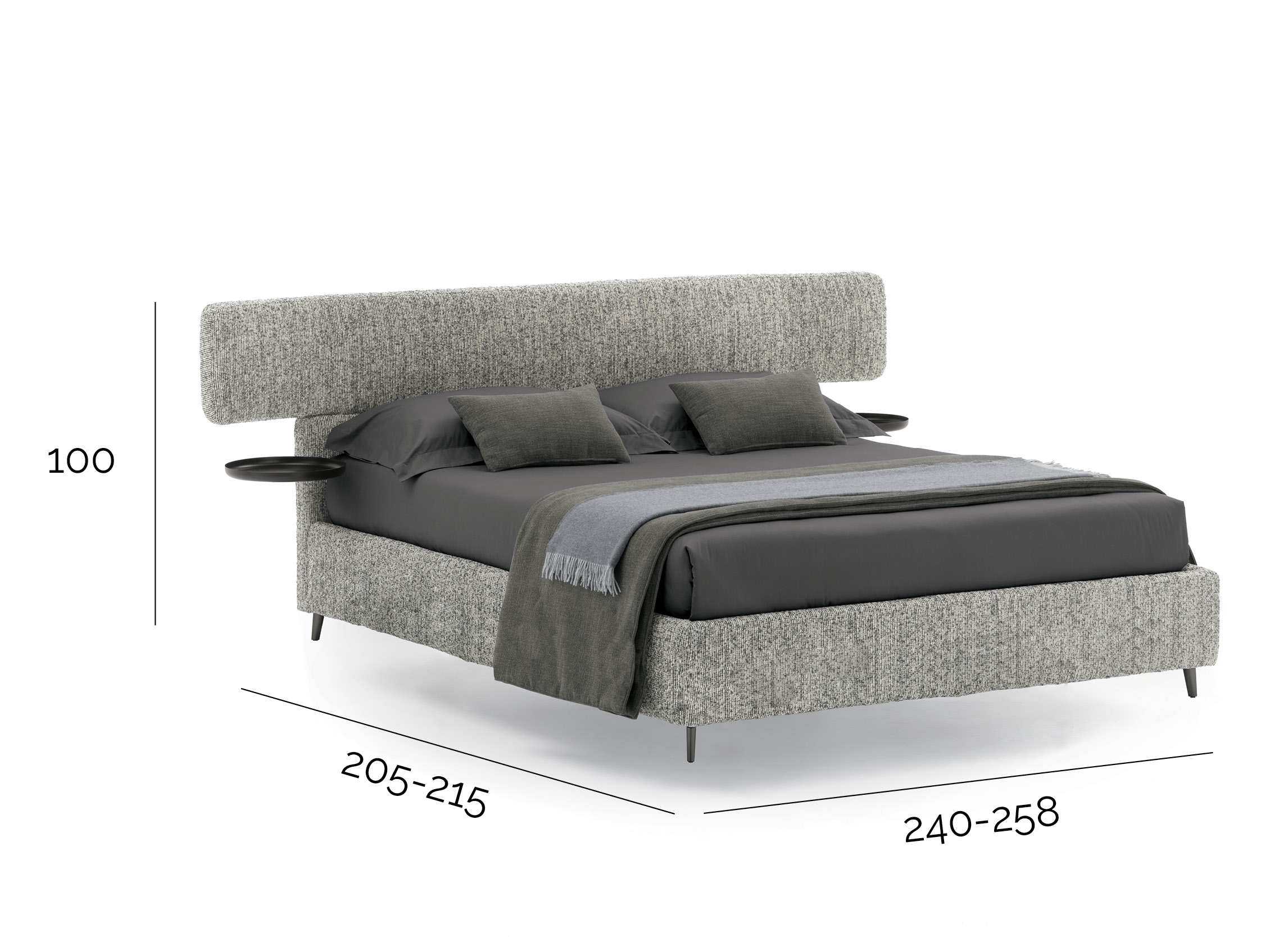 La testata curva leggermente verso l’interno, creando un abbraccio visivo e funzionale. Una forma pensata per aumentare la sensazione di comfort e accogliere con naturalezza gli elementi d’arredo integrati.