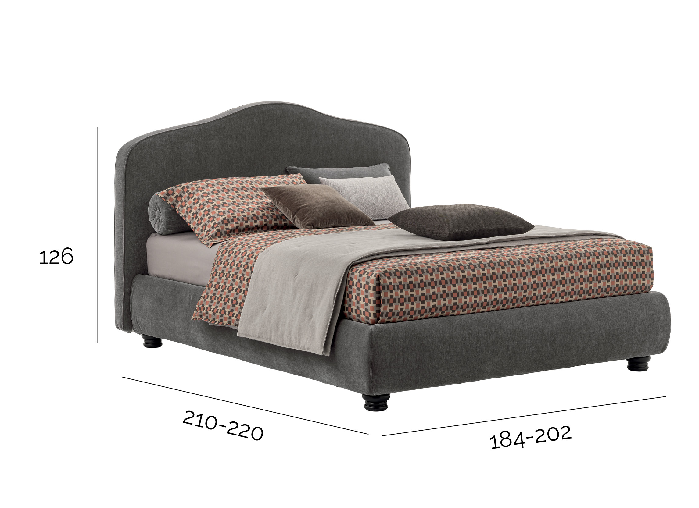 L’ampia testata ha un design curvilineo che riprende le forme bombate del giroletto e dei piedini. Un letto classico che rende eleganti anche camere moderne.