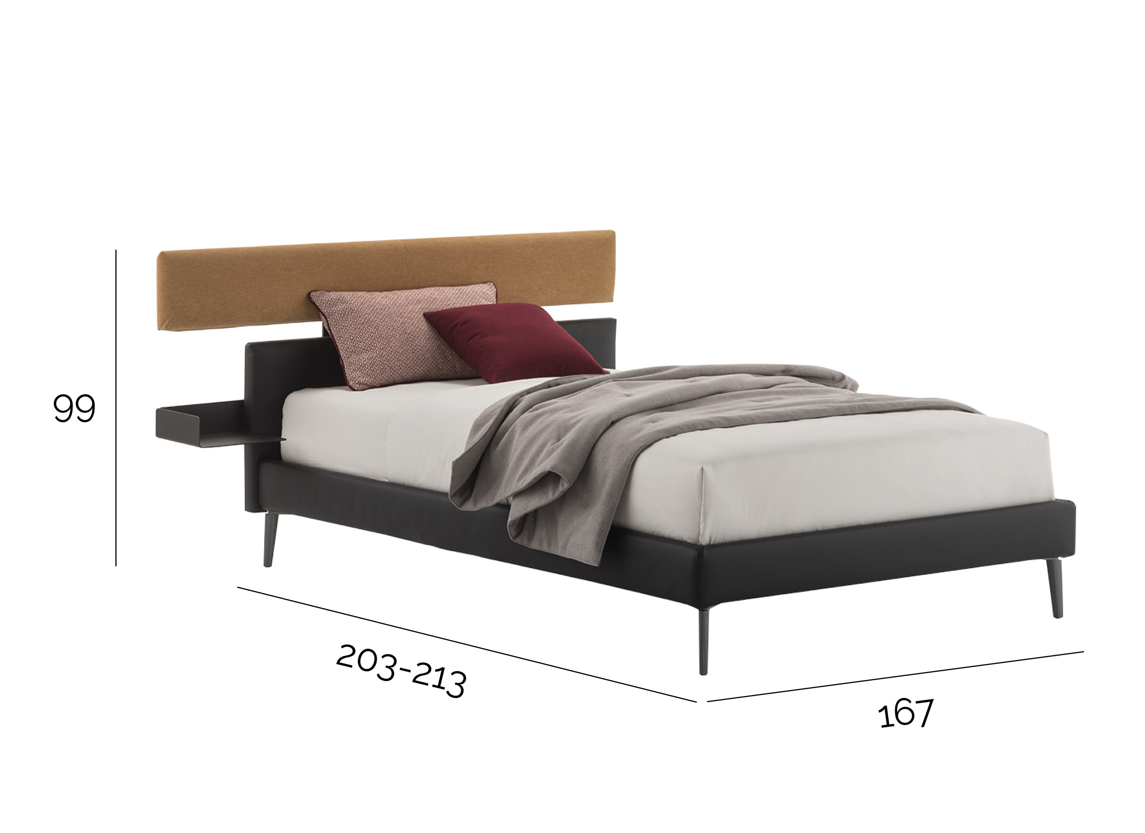 A fianco del letto viene integrato alla testata un comodo piano d’appoggio che funge da tavolino, ma al tempo stesso permettere di salvare spazio.