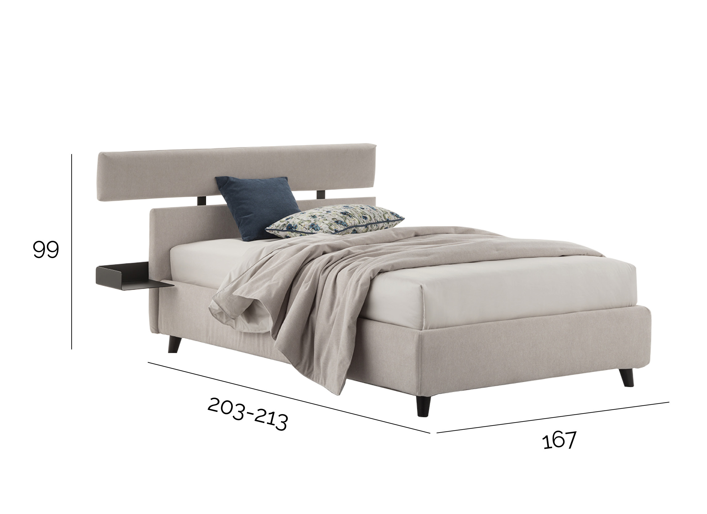 Design contemporaneo e giovanile per un letto a una piazza e mezza con comodino integrato. La testata è unica con un pannello imbottito più lungo personalizzabile: in tinta unita, tono su tono, con colori a contrasto o fantasie.