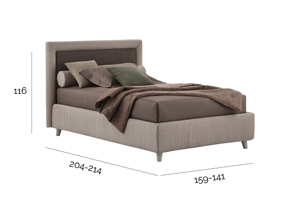 Una cornice imbottita racchiude la testata e le tonalità a contrasto della doppia finitura mettono in risalto gli spessori. Un letto che assicura sogni morbidi e sereni.
